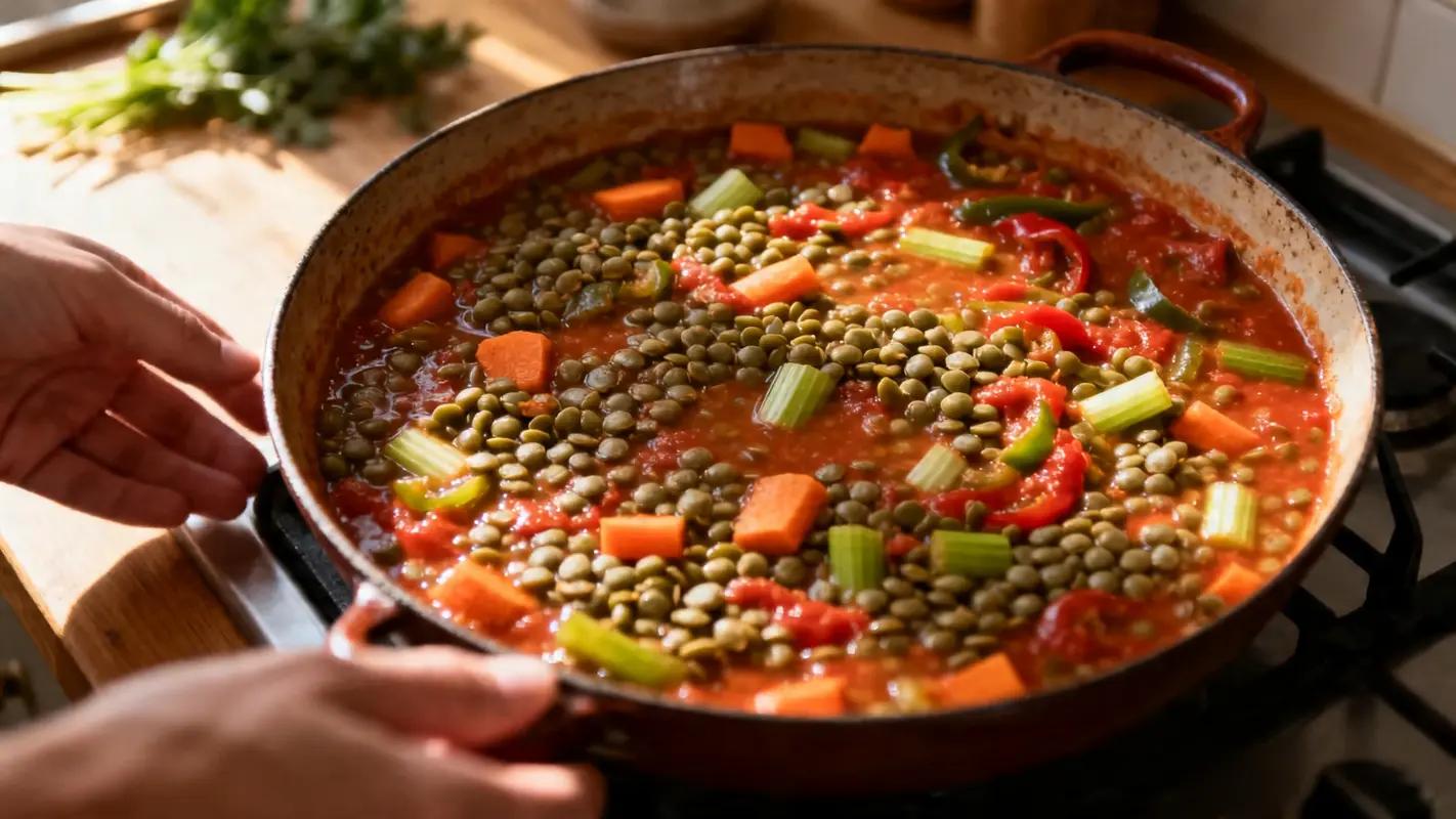 Het gerecht waar ik elke week op terugval is een groenterijke linzenstoof op basis van groene of bruine linzen. Linzen zijn niet alleen betaalbaar en veelzijdig, maar ook uiterst stabiel in de bereiding. Ze koken gelijkmatig, behouden hun structuur en leveren vanzelf een romige, gebonden saus zonder extra toevoegingen.