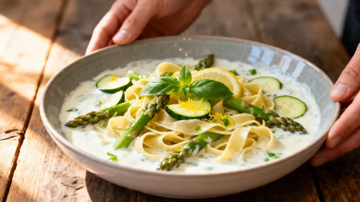Het geheime element dat dit 20-minutengerecht zo bijzonder maakt, is crème fraîche. Dit zuivelproduct zorgt voor een romige basis zonder dat het zwaar wordt. Het heeft een lichte zuurgraad die perfect past bij lentegroenten zoals groene asperges en courgette.