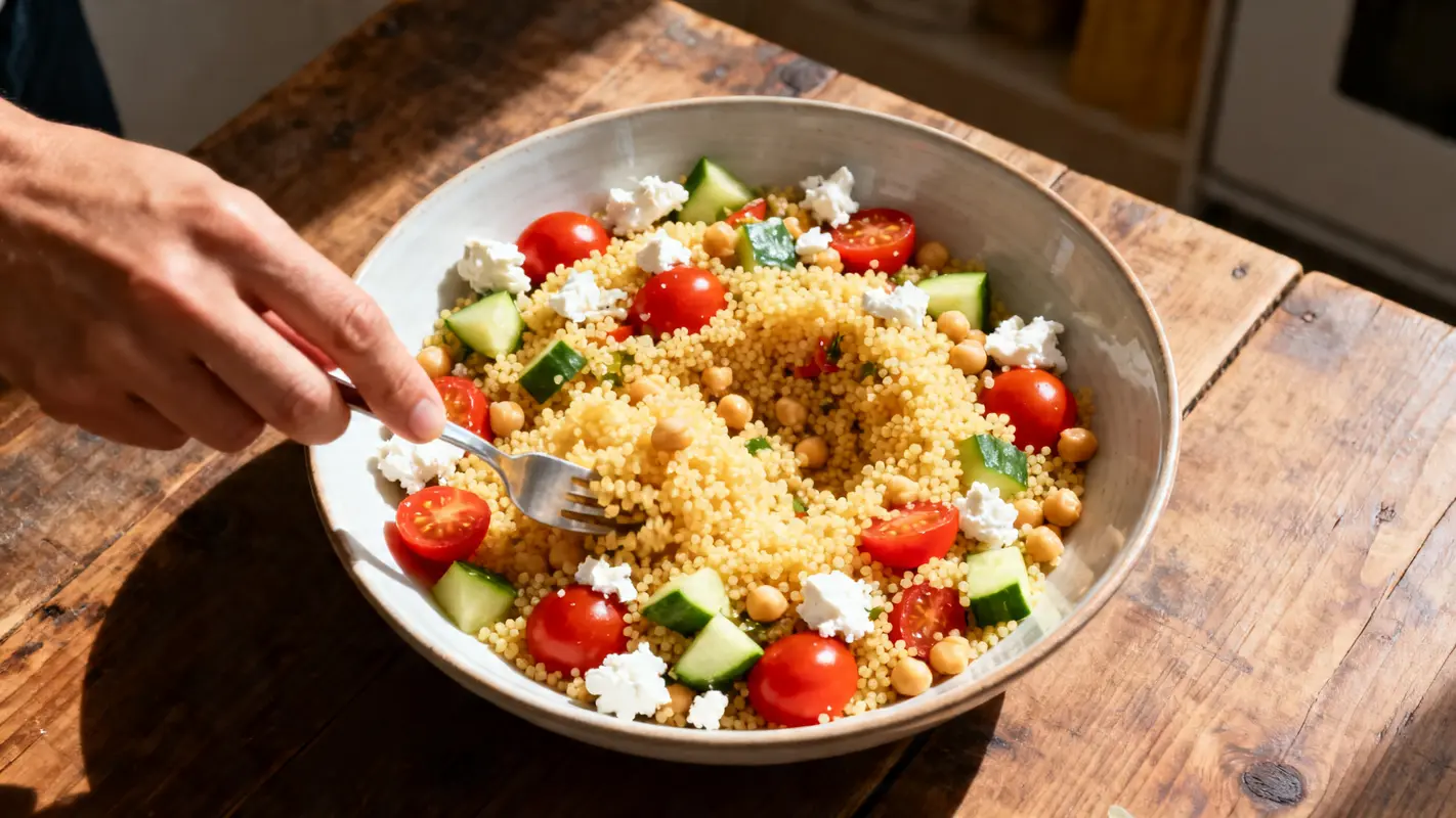 De sleutel tot dit gerecht is couscous van durumtarwe. Couscous is een van de snelst te bereiden graanproducten. Het heeft geen kooktijd nodig. Alleen heet water, een paar minuten wachten en het is klaar. Dat maakt het ideaal voor snelle lunches.
